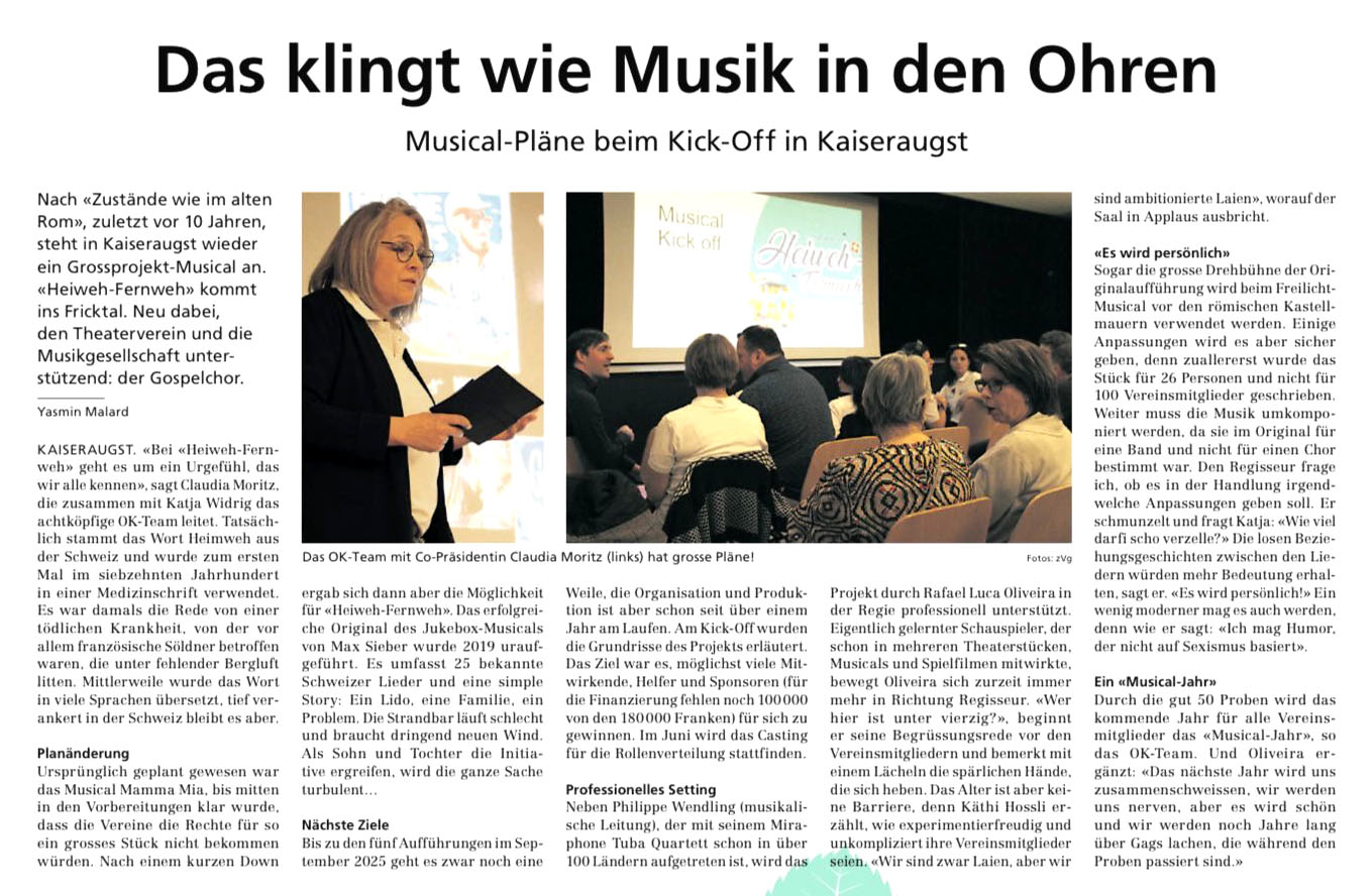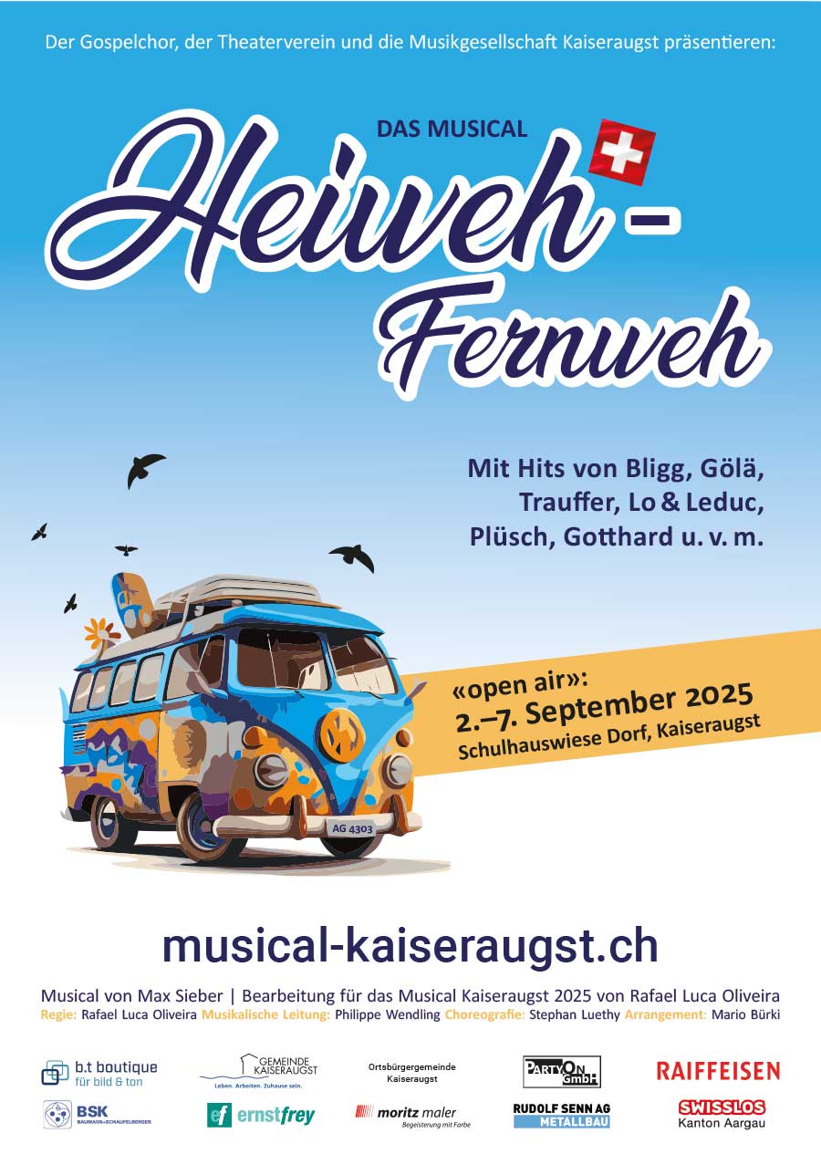 Nach dem erfolgreichen Musical «Zustände wie im alten Rom» im Jahr 2015, bringen der Gospelchor, der Theaterverein und die Musikgesellschaft Kaiseraugst gemeinsam das Schweizer Musical «Heiweh – Fernweh», nach dem Buch von Max Sieber, auf die Bühne.